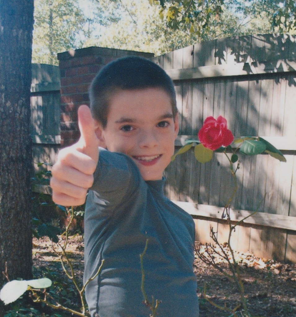 Granny lived a long and happy life and we celebrated that just one week after that Easter service. We all grieved in our own way, and life moved on. But as October arrived my son began to feel sad that he wouldn’t be able to celebrate his birthday with his birthday buddy. Two days before his birthday he was outside shooting hoops after school. He came running in and told me that Grandaddy’s rose bush had a bloom on it. (I had transplanted this bush from the family farm about 20 years prior to this date.) I reminded my son quickly that the rose bush only bloomed in April, and sent him back outside. He quickly returned insisting the rose bush had a bloom. This time I reminded him that we were in a drought and the bush was dormant at the time. I told him there was still a bloom on the Camelia bush and sent him out again. A third time he came in insisting the rose bush had a bloom. So I finally went outside with him – to prove him wrong of course – and was left in total amazement at the sight of a single red rosebud among several green leaves on one stem of the rose bush!