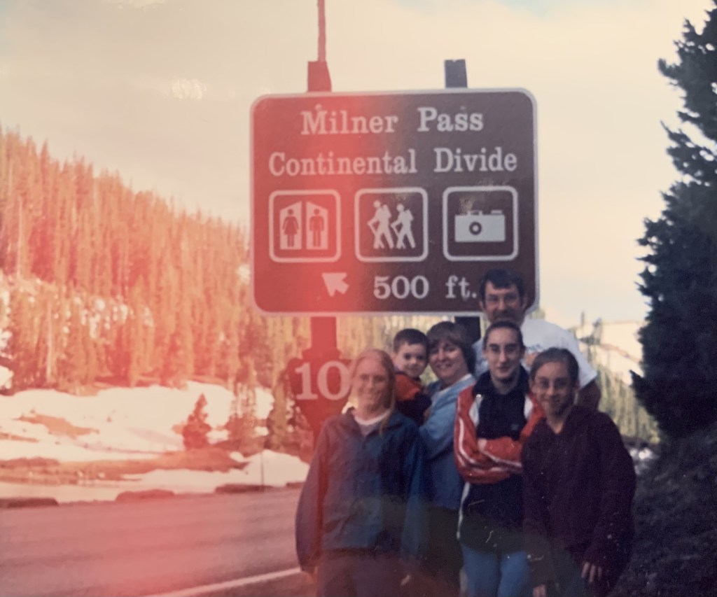 We made our way back to the vans and began the last leg of the journey to the Divide. The snow had only begun melting at the divide in recent weeks so the road had only opened the week before. We were determined to make it there for a photo opportunity of a lifetime. This drive became even more fearful for me. The road narrowed, the guard rail seemed minimal to my right. The view now consisted of steep rocky drop offs. I kept my eyes focused on the rocky mountain on the driver’s side of the road. That view was almost as fearful. It looked so close I was certain my sister could have reached out the window and touched the mountain. This part of the drive was a good bit slower as we curved left and right winding our way up the mountain. Finally, our destination was in site. A small ranger station was there along with the sign stating the altitude and the name of this particular pass over the Continental Divide. We bundled up in our jackets to pose in front of the sign. At least, my own family did. You see, my sister had done research when planning our trip and learned this particular pass was called “Milner Pass”, which of course is our last name. After snapping a few photos, the kids made a snowball or two. (Just maybe we adults did as well.) We observed a few bighorn sheep up above us at the top of the mountain behind the ranger station. We loaded back up and started back down the mountain. The kids were promised items from the gift shop before leaving the park. Honestly, I don’t remember the drive back down. I do remember the gift shop. And I do remember the huge elk in the middle of the road at the exit of the park. Our son was very concerned for my safety when I got out to take photos of the elk, along with several other tourists. The drive home held less anxiety for me than the drive up did. I had survived my fears!