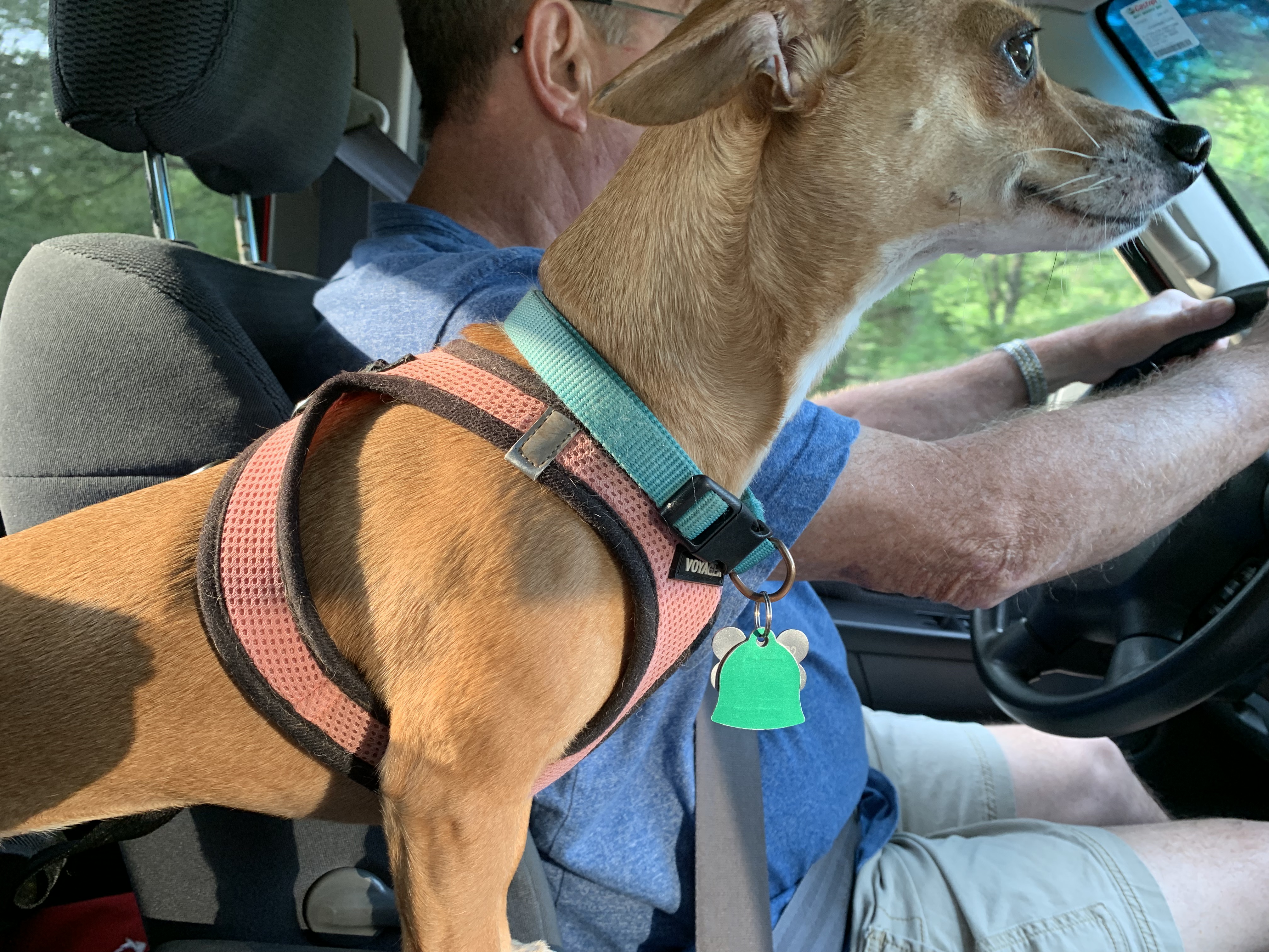 When we ask our dogs if they are ready to go for a ride, they get excited and bounce all around the living room. They load up quickly and settle into their chosen spots. The younger, smaller dog, thinks she is the boss and she chooses to stand between the front seats with her front paws on the truck console.