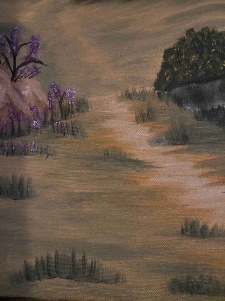 When I awake in the middle of the night, I often recite Psalm 23 in my mind. It usually takes “saying” it twice before my mind gently drifts back off to sleep. However, in recent months, my mind has sort of taken on “a mind of its own” whenever I try this tactic. Recently, it has begun visualizing the things I recite in my mind. I make it fine through the first part; “The Lord is my shepherd, I shall not want.” The next sentence is where my mind goes off track. “He makes me lie down in green pastures.” finds my mind jumping to a favorite painting done by my mom. As I say in my mind, “lie down in green pastures;” my mind jumps to the grassy area to the left of the path. I imagine myself lying in soft green grass looking up at the sky. I mentally start over on the passage and make it to the next line before my mind wanders again. “He leads me beside still waters” has me picturing my feet dangling in the water of the stream to the right. I wrangle my brain back to the beginning of the Psalm once again.